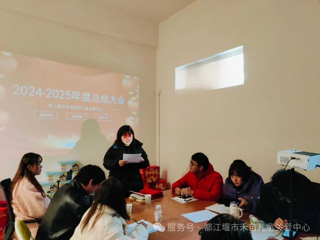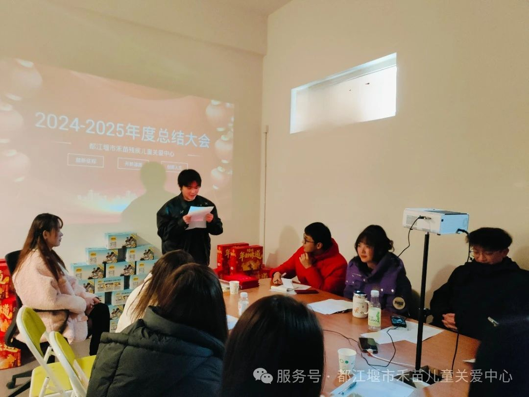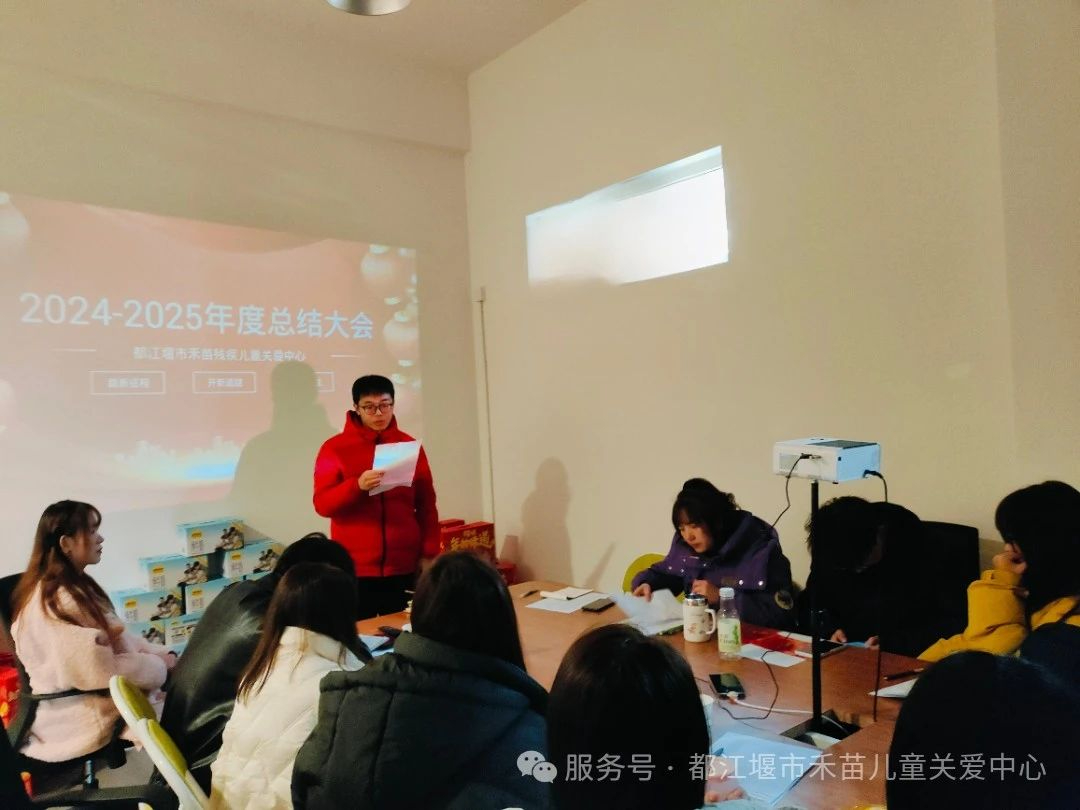最后,都江堰市禾苗儿童关爱中心负责人黄涛对本年度工作总结,她充分肯定了全体教职工辛勤付出,对各部门工作成果给予高度评价,同时也指出工作中存在的不足,并提出针对性的改进措施。 在寒假工作安排方面,明确了教师学习任务、值班人员安排以及安全维护等相关事宜,要求大家在假期保持通讯畅通,确保事务的顺利衔接。